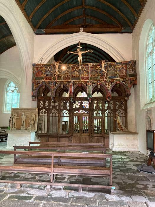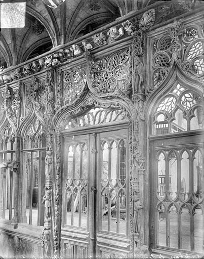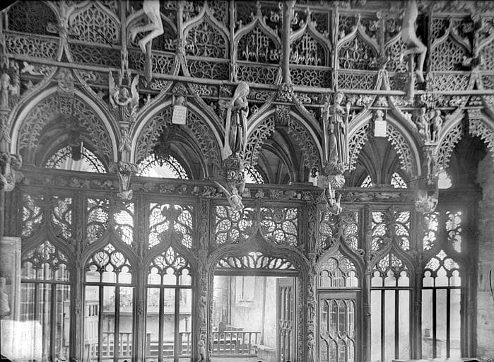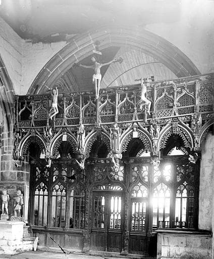 Jubé reposant sur un chancel de bois (ouvert par trois portes ornées de statuettes rappelant la vie de saint Fiacre), avec deux rangées d'arcatures en cintre brisé et de croisées d'ogives à clefs pendantes. Du côté de la nef, le jubé est dominé par un Calvaire et du côté du choeur, les arcs d'encadrement, des arcades en lancettes séparent dix panneaux aux remplages flamboyants ajourés.
