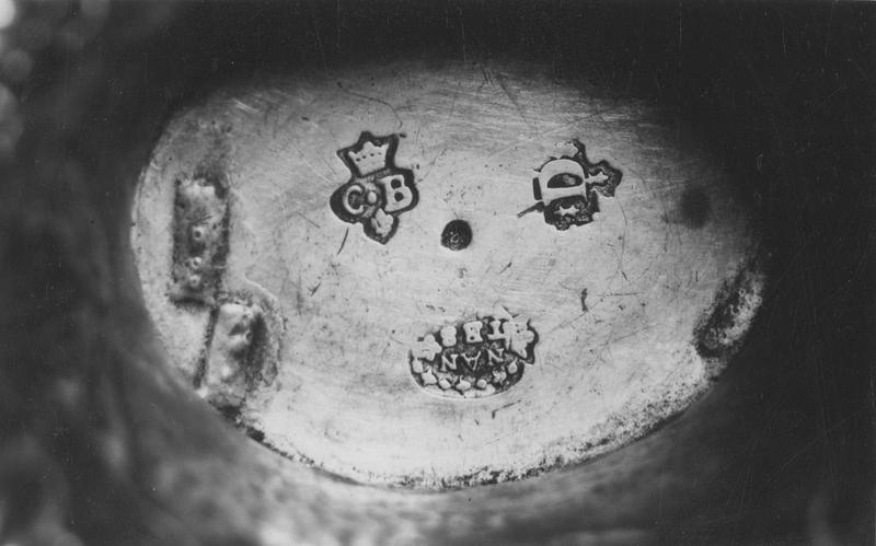 Inscription : Donné par Jacquette Houaix, fe de Danielo, à la paroisse des Fougerais (base, sur le rebord). Date : l'an 1773 (poignée). Poinçon de maître : C B au-dessous d'une couronne et au-dessus d'une fleur de lys, poinçon de maître probable de Charles Brouard, orfèvre à Nantes, signalé dès1742 (sous la base). Poinçon de ville : NAN, avec au-dessous TES, avec une fleur de lys de part et d'autre, et six points au-dessus, poinçon de Boistaud, sous-fermier de 1769 à 1790 (sous la base). Poinçon : D, avec une étoile de part et d'autre et au-dessous, et une couronne au-dessus, poinçon indiquant le millésime 1771 (sous la base).