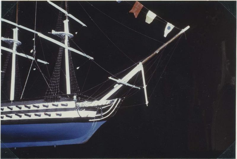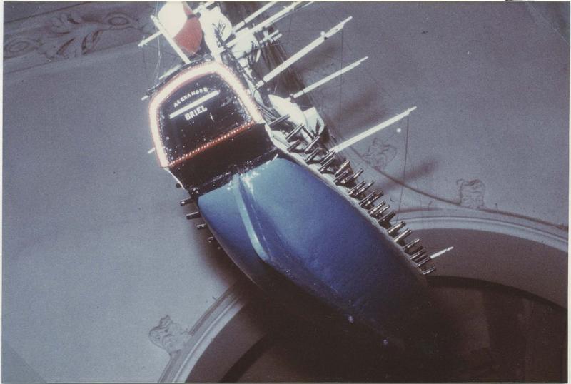 Maquette de la frégate trois mâts carré l'Alexandre Briel. Coque : au-dessous et entre les batteries en noir ; sous ligne de flottaison en bleu ; aux niveaux des deux batteries inférieures en blanc ; gouvernail non mobile. Armement : deux batteries de chaque côté et une troisième batterie de trois canons sur le pont et deux sabords de retraits à la poupe ; canons : fûts noirs et gueules rouges. Pont : pont et gaillard arrière en rouge, une embarcation blanche, de part et d'autre du mât d'artimon. Mâture : quatre vergues et deux hunes à chaque mât ; bas mâts, vergues, hunes, beaupré en bleu ; corne d'artimon en blanc (avec un fanion tricolore) ; onze fanions de coton entre le bout dehors et le mât de misaine.