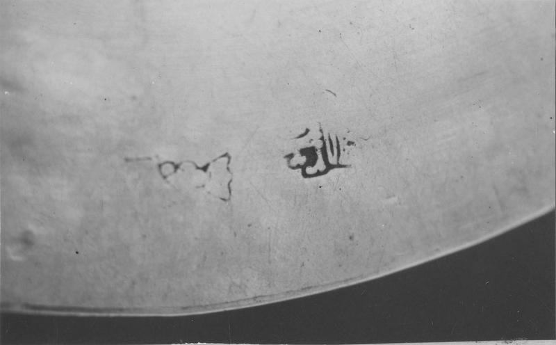 Armoiries : (sous la base). Poinçon : fleur de ly et A, avec une fleur de lys au-dessous (?) (calice). Poinçon : I D, avec deux points et une couronne au-dessus (calice). Lettre couronnée : B avec une couronne au-dessus (calice). Lettre couronnée : F avec une couronne au-dessus (patène). Poinçon : fleur de lys, avec un point au-dessous à gauche, et une couronne au-dessus (patène).
