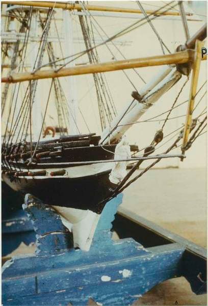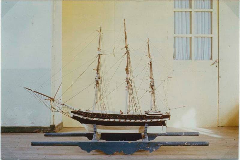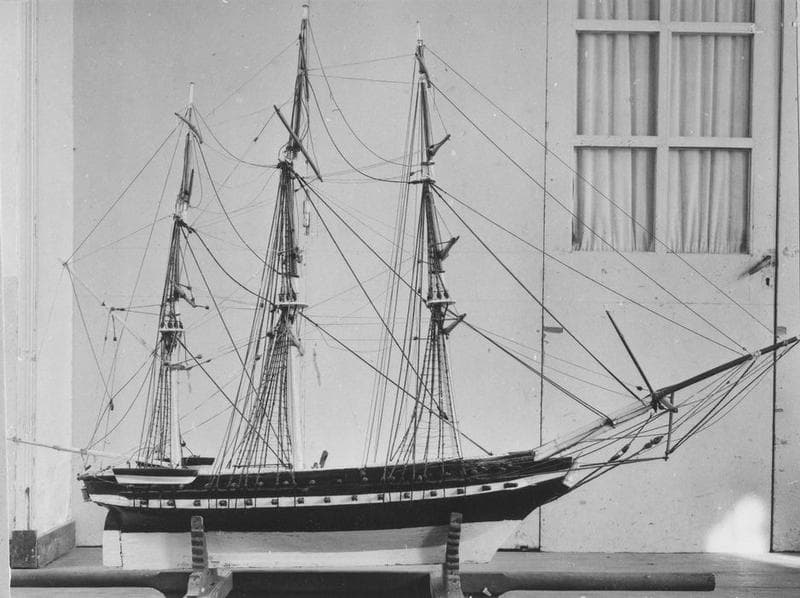 Maquette, trois mâts carré, frégate, le Pie IX. Coque : taillée dans la masse ; noire, blanche sous la ligne de flottaison, bande blanche au niveau de la batterie inférieure. Armement : deux batteries (au total soixante sabords) ; canons en métal noir et gueules rouges. Pont : ocre rouge ; à l'arrière de chaque côté, un canot creusé dans la masse et suspendu à l'extérieur (canot noir et blanc) ; gaillards avant et arrière (blancs) surélevés. Mâture : quatre vergues (jaunes) et deux hunes à chaque mât (mât jusqu'à la première hune blanc et ensuite couleur bois).