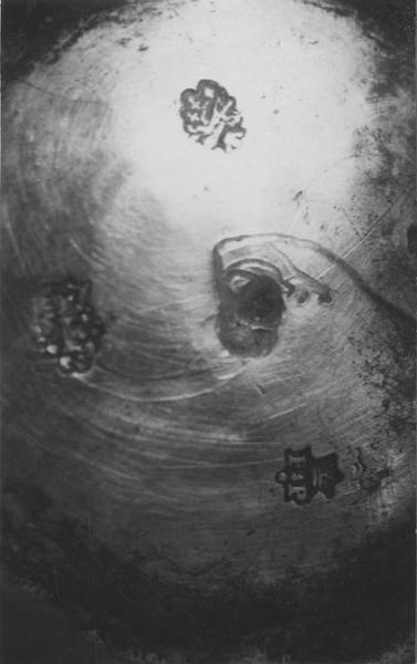 Poinçon : F P séparés par une hermine, sous une couronne (sous la base). Poinçon : E surmonté de trois points, avec une croix (?) au-dessous (sous la base). Poinçon : hermine couronnée, avec deux éléments au-dessous (?) (sous la base).