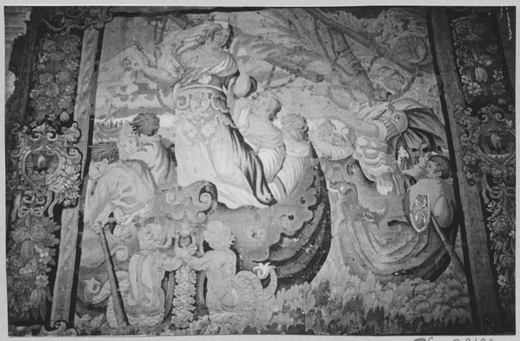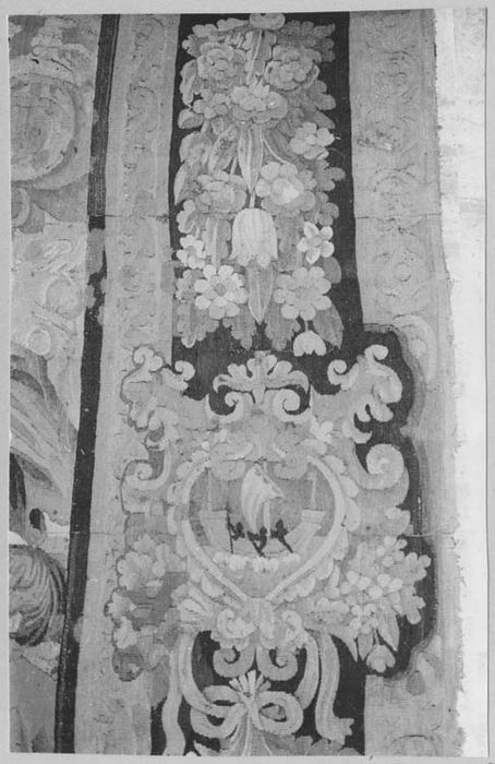 L'un des médaillon a été recouvert ultérieurement par les armes des Berset d'Hauterive. Cette tapisserie provient de la succession du château d'Hauterive à Argentré en Mayenne. Changement de propriétaire le 20/11/1987.