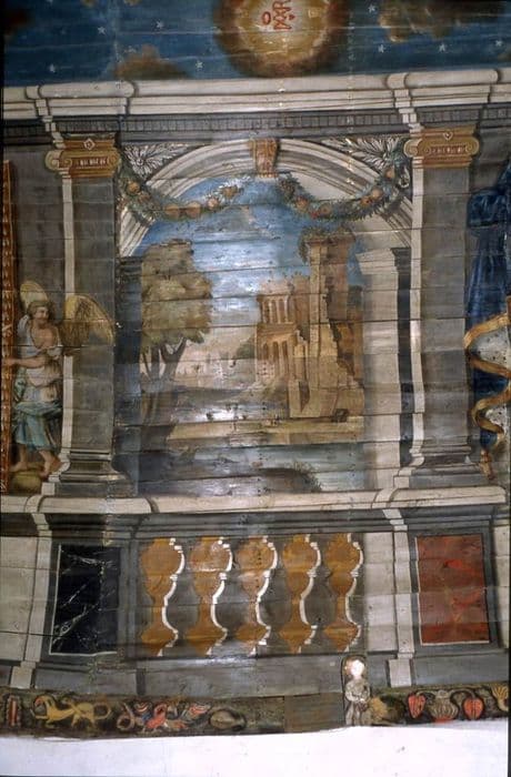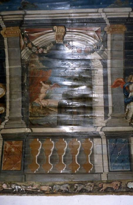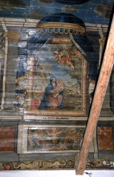 Sablières, entraits et lambris. Voûte peinte côté nord et côté sud. Sablières sculptées conservées sur vingt mètres de long, de chaque côté. Deux entraits sculptés se trouvant au-dessus de la tribune.