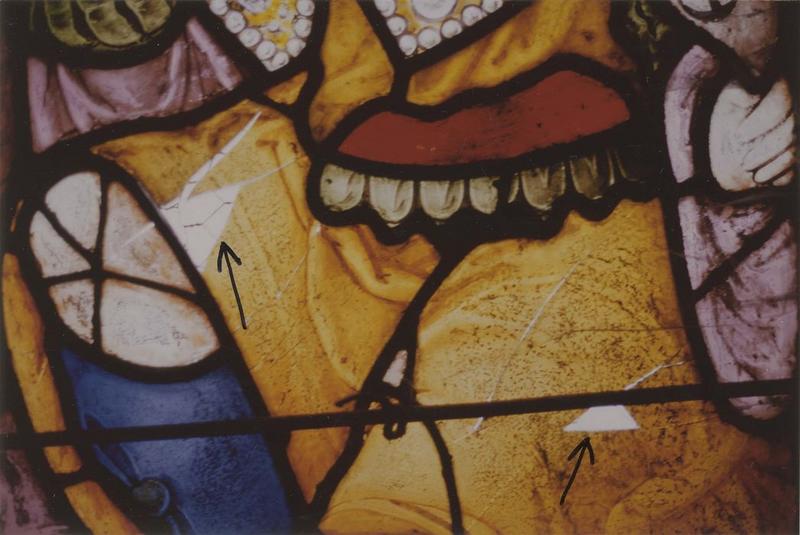 Fenêtre de l'abside : l'Arbre de Jessé, divisé en quatre travées. Fenêtre du croisillon Sud : la Passion, divisée en dix panneaux. La Circoncision.