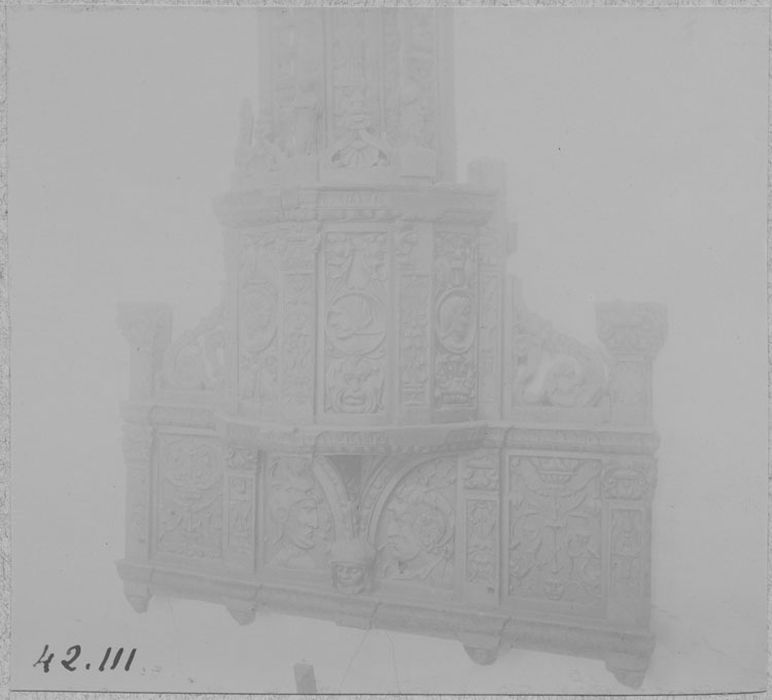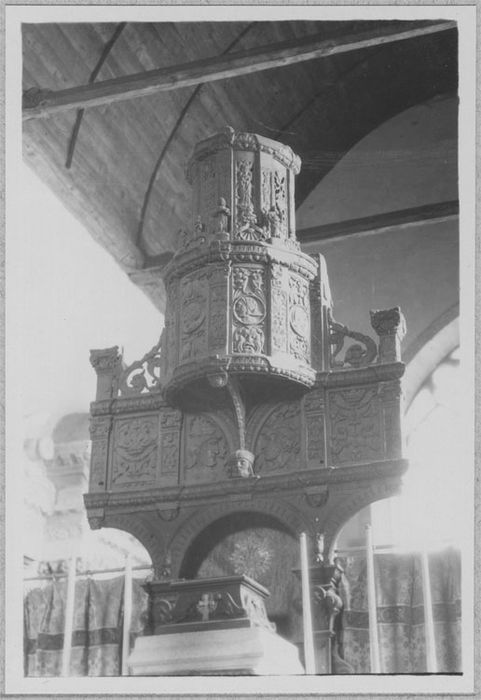 Tambour octogonal formé de pilastres supportant un couronnement pyramidal et formant lui-même encorbellement sur une partie plane à décor de pilastres, rinceaux et médaillons.