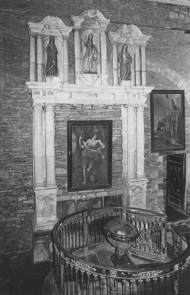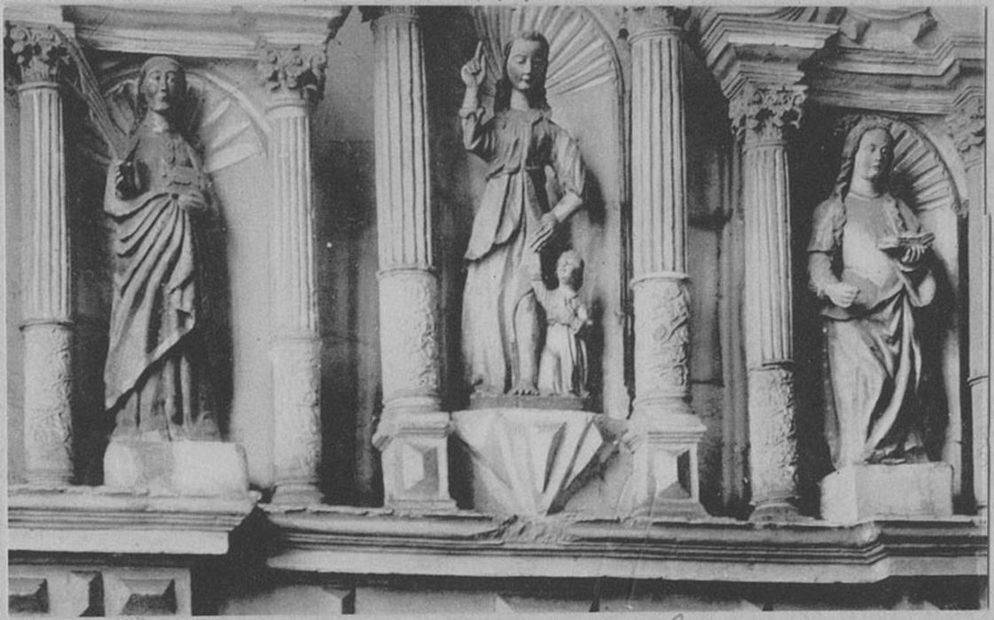 Retable en pierre blanche sculptée et ses trois statues en bois polychrome : l'ange gardien et deux saintes femmes, début 19e siècle.