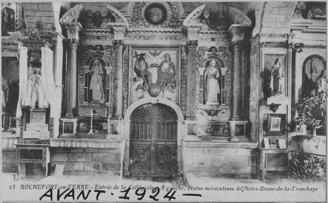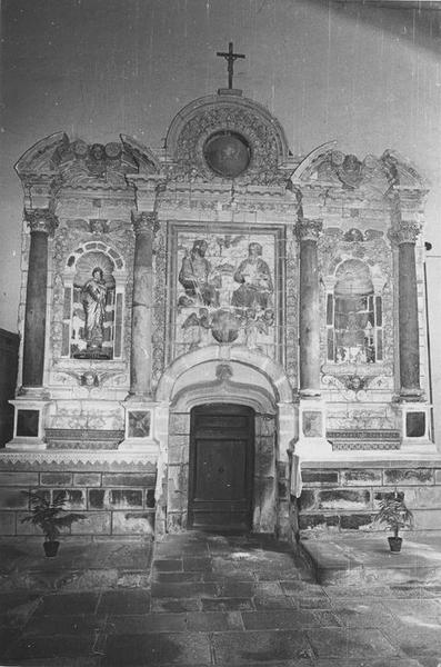 Retable de l'arrière choeur (mur Nord) , avec bas-relief la Trinité, pierre sculptées polychrome et porte à deux vantaux (mus Sud) , fermant autrefois la baie cintrée du retable, chêne sculpté, 17e siècle. Retable constitué de deux travées symétriques encadrant un tableau central. Deux colonnes corinthiennes supportant un entablement surmonté d'un fronton cintré à ressauts latéraux, forment une travée. Entre les colonnes, des chérubins voisinent avec des cornes d'abondance, formant console et encadrant la niche en plein cintre qui protégeait la statue. Le fronton est sculpté d'un chérubin entouré d'un cadre rectangulaire dans le quel est sculpté la sainte Trinité. Au-dessus de l'entablement est sculpté une corniche en plein cintre, formant fronton, ornée d'un décor végétal. Au centre dans un oculus apparaît le globe céleste. La baie en anse de panier qui faisait passage entre le choeur et la nef a été réduite par une ouverture postérieure. On conserve cependant la porte en chêne à double battants qui la fermait.