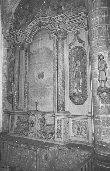 Autel, tabernacle et retable du transept Sud, ses statues, bois polychrome, 18e siècle. Le soubassement, les gradins et le tabernacle, très décorés supportent le retable à trois panneaux. La travée centrale rectangulaire est fermée au sommet par un arc en surplomb de forme curviligne. Deux colonnes corinthiennes encadrent le panneau central et supportent un entablement horizontal sur le quel sont posés en alignement des colonnes et deux pots à feu. Les deux travées latérales sont ornées de lambris sur le quel s'appliquent deux niches protégeant les statues. Une tête d'angelot est placée au sommet de la courbe du panneau central. Deux autres forment consoles sous le socle des statues.