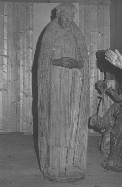 Très grande statue en un seul bloc, anciennement polychrome. Les bords de la chape sont sculptés de six personnages. Les mains ont été refaites récemment.