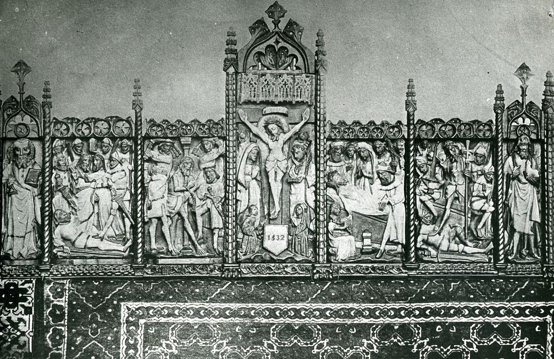 Anciennement décrit comme étant en marbre. Une légende déroulée sur le mur nous apprend en mots entrecoupés de sculptures bizarres et souvent indécentes que le choeur et ses ornements furent achevés de 1475 à 1494.