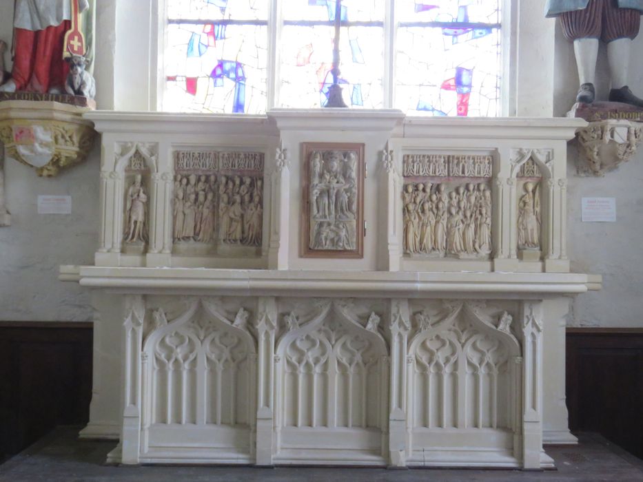 Beau retable en albâtre en plusieurs morceaux réunis sur l'autel de droite. En tout, quarante sept personnages de figures expressives, sculpture habile et détails finis.