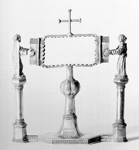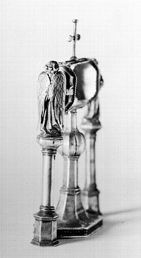 Reliquaire pédiculé. Cylindre horizontal et crucifix, soutenu par deux anges fixés sur deux colonnes renflées et par un pied dont la tige hexagonale est centrée d'un noeud sphérique et porte l'écu de Bretagne à sa base. Une galerie formant terrasse réunit le pied du reliquaire aux bases des deux colonnes.