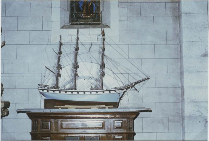 Maquette de procession du trois mâts carré de commerce le saint-Nicolas de la compagnie Bordes de Nantes. Coque : au-dessous de la ligne de flottaison, en marron, au-dessus en gris bleu, bande blanche au niveau de la fausse batterie (sabords noirs) liseré or et bandes blanches puis noire en bordée ; la figure de proue représente saint Nicolas. Armement : une batterie de treize faux sabords de chaque côté. Pont : sur le pont, vergue et mât de remplacement, cabestan, cloche, treuil en bois, . . . ; pont et gaillards de couleur bois ; deux embarcations suspendues dont une disparue à tribord. Mâture : cinq vergues à chaque mât ; voiles ferlées (sculpture dans le bois) ; pavillon de la Cie au premier mât.