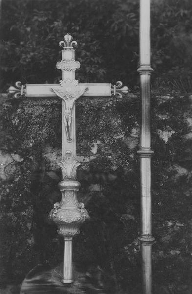 Croix processionnelle. Au revers, effigie de saint Pierre, patron de la paroisse. Le bâton qui ne porte pas de poinçon paraît daté du 19e siècle.
