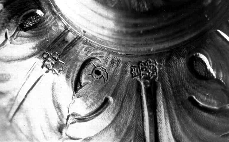 Poinçon de maître : J P M T, poinçon de maître de Joseph Pierre Marie Tiret, orfèvre à Vannes (à la base du noeud). Lettre-date : K couronné, poinçon de la jurande de Vannes pour 1776-1777 (à la base du noeud). Poinçon de ville : 9 couronné, poinçon de la généralité de Rennes (à la base du noeud).