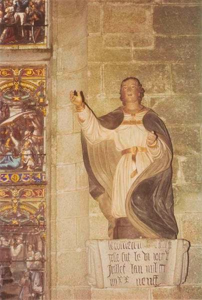 Statue d'un personnage agenouillé sur une console portant une inscription. Personnage en bois polychrome. Console en granit peint.