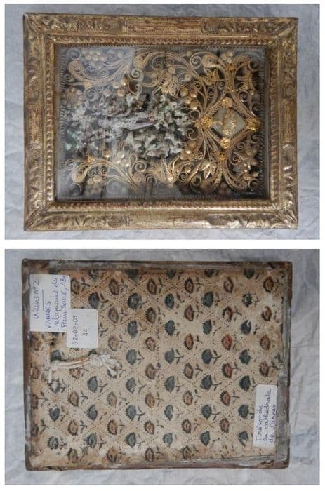 Le tableau reliquaire est composé d'un cadre en bois doré et d'une plaque de verre.