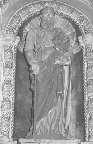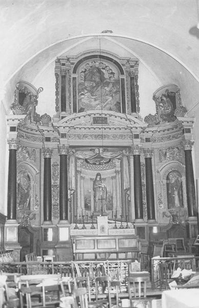 Marbre noir de Sablé, tuffeau et terre cuite. Retable à deux niveaux et trois corps encadrés chacun par deux colonnes de marbre noir à chapiteaux corinthiens. Deux ailes latérales sont incurvées et comprennent une niche cintrée avec au Sud, le groupe de sainte Anne et la Vierge (19e siècle, plâtre) et au Nord, saint Joachim (17e siècle). Les statues reposent sur des consoles ornées de blasons. La niche centrale comprend une statue de la Vierge à l'Enfant (19e siècle). L'entablement est à ressauts avec un fronton central curviligne. Dans les parties supérieures latérales, niches avec les statues de sainte Ursule au Sud et saint augustin au Nord (toutes deux en terre cuite). Le tabernacle plat, en bois, est rapporté (porte décorée d'un calice, début 19e siècle). Le retable est amputé de sa partie inférieure dans laquelle s'ouvrent deux portes latérales. L'autel a également disparu.