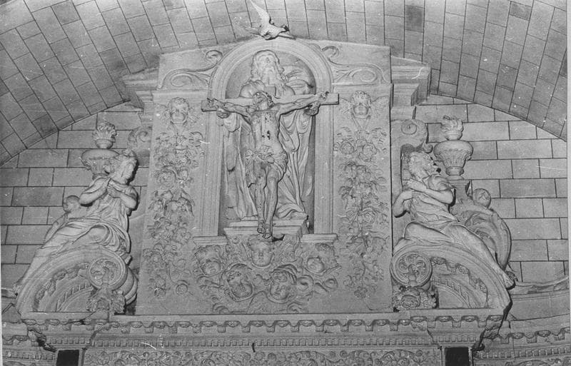 Tuffeau. Retable à trois niveaux horizontaux et à trois travées (un corps central et deux ailes incurvées). Soubassement avec stylobates et deux portes avec motifs peints de saint Pierre et saint Paul. Niveau intermédiaire avec toile peinte (La Trinité), deux colonnes en marbre encadrent les ailes, au centre, niches avec statues de la Vierge à l'Enfant (au Nord) et de saint Joseph, décor de chutes de fleurs et de fruits et consoles ornées d'angelots, frise de rinceaux et modillons. Le niveau supérieur se compose d'une niche centrale avec statue de la Trinité (17e siècle), de part et d'autre de la niche, fronton rompu avec anges orant et volutes surmontées de pots de feu, corbeilles de fleurs en couronnement des ailes et pot à feu aux extrémités.