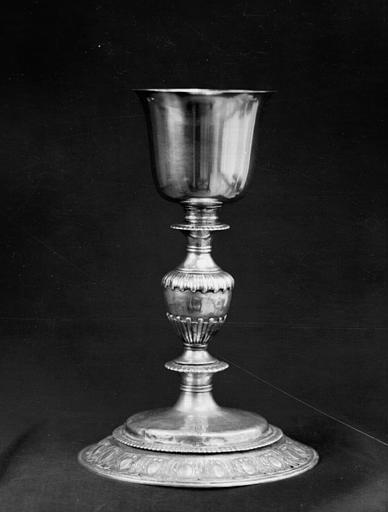 Anciennement daté du 17e siècle. Oeuvre perdue avant 1969. Mgr Antoine-Xavier Mayneaud de Pancemont a été évêque de Vannes de 1802 à 1807. Il était originaire de Digoin (Saône-et-Loire). C'est lui qui a dû apporter ce calice qui appartenait à quelque membre de sa famille.