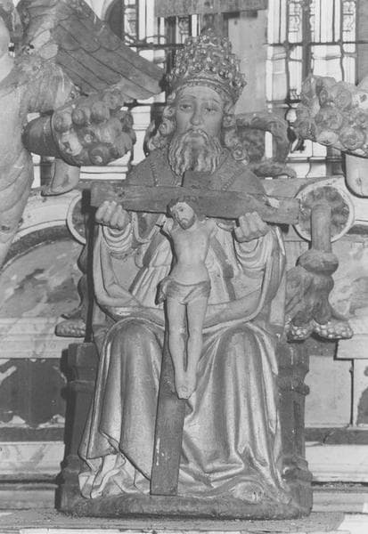 Sculpture en ronde-bosse. Les bras du Christ ainsi que la colombe du Saint-Esprit ont disparu. Une polychromie fin 19e siècle trahit la sculpture.