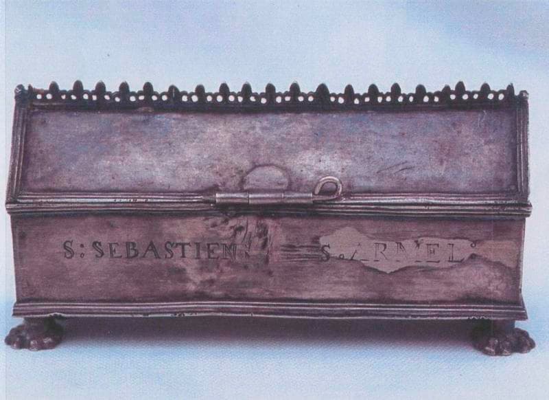 Le reliquaire double, en forme de chapelle, est porté par quatre pattes de lions. Décor du faîte du toit d'une série de fleurs de lys. Inscription sur une des faces : S : SEBASTIEN S : ARMEL, rappelant la double dédicace du reliquaire. Petit fermoir en arge