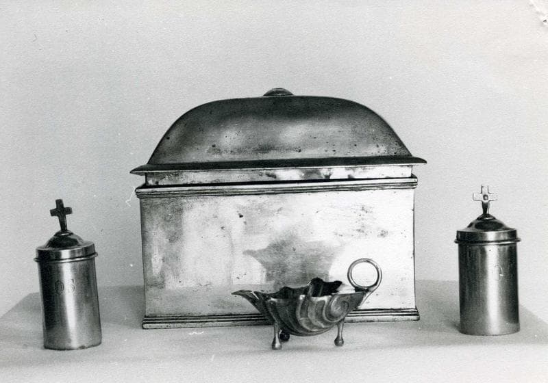 POP | Plateforme ouverte du patrimoinecoffret aux saintes huiles, coquille de baptême et deux ampoules aux saintes huiles