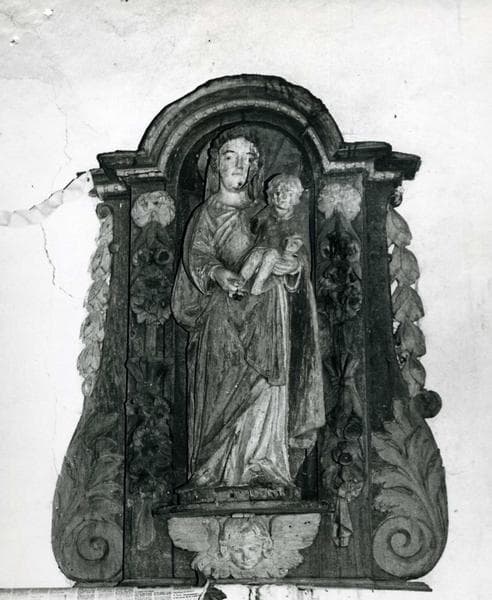 Statue de la Vierge à l'Enfant dans un élément de retable composé d'une arcade soutenue par deux pilastres encadrée de volutes.