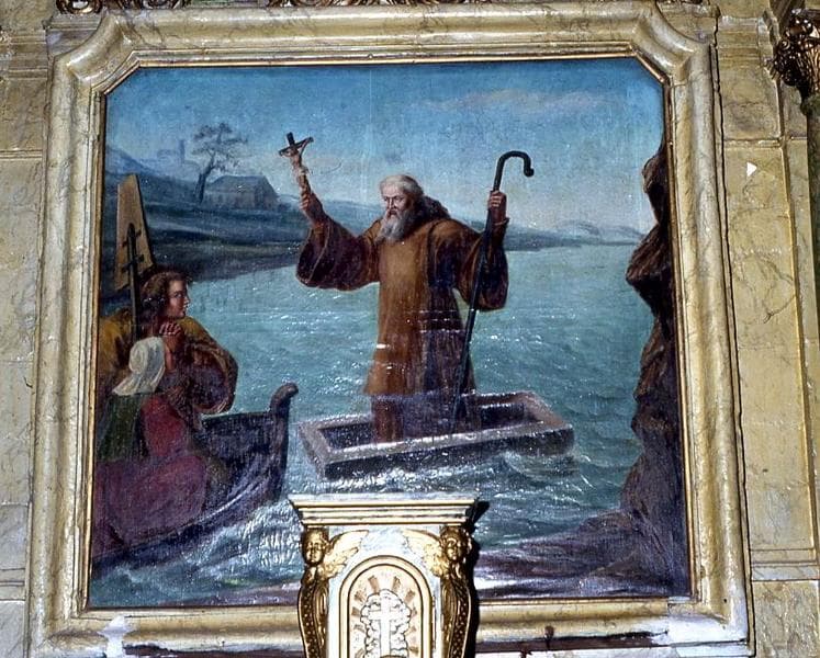 Saint Philibert apparaît sur une barque, brandissant un crucifix et s'appuyant sur une canne. Devant lui, un homme et une femme sont en prière dans une autre barque.