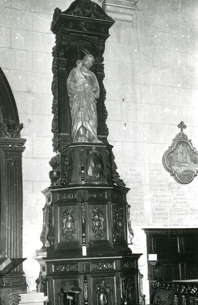 Haut socle à trois niveaux, en bois sculpté, accolé au mur supportant la statue de saint Joseph et l'Enfant. Celle-ci est abritée dans une niche flanquée de deux pilastres et de chutes de fleurs, surmontée d'un petit dais à la manière d'un fronton.