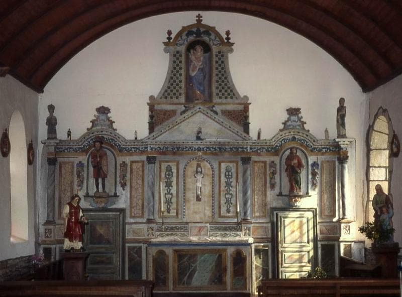 POP | Plateforme ouverte du patrimoineautel, retable, deux statues : Saint Louis (croisé ?) et Vierge à l'Enfant, deux statues (statuettes) : Saint Yves et Vierge à l'Enfant et une statue (statuette) porte-cierge : Ange