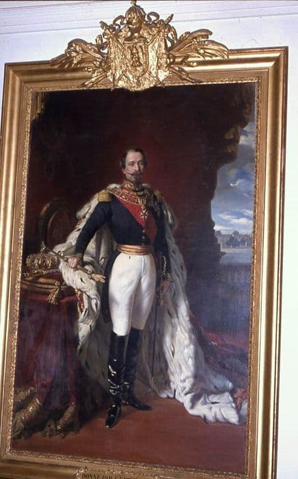 Portrait de Napoléon III en pied. Il porte un uniforme recouvert du manteau de pourpre doublé d'hermine, et se détache sur un fond de draperie rouge. Il porte le collier de la Légion-d'honneur et l'écharpe de moire rouge. Il tient la main de justice et s'appuie sur un table où sont posés la couronne et le sceptre.