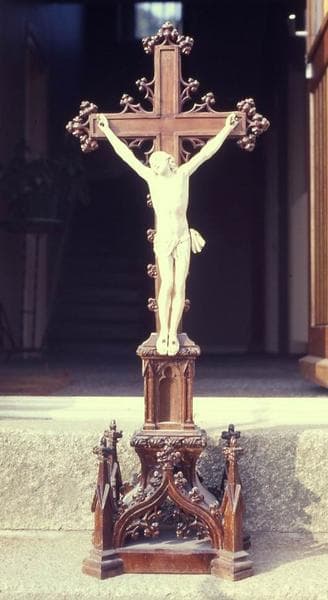 Christ en ivoire sur une croix en bois de style néo-gothique : la base de plan carré, assez importante, est formée d'arcatures ajourées flamboyantes bordées de pinacles aux quatre angles. Cette base est surmontée d'un piédestal à arcatures aveugles, qui porte la croix ornée de rosettes et de petites arcatures.