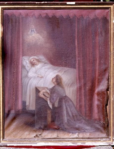 Une femme allongée dans son lit, les yeux fermés. Une jeune femme, à ses pieds, prie devant un pupitre et lève les yeux vers l'apparition de la Vierge.
