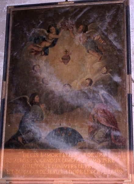 Le Sacré-Coeur, couronné par deux angelots, apparaît dans une trouée de lumière.