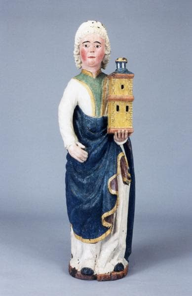 Sainte Barbe porte sur la paume de sa main gauche une tour miniature.