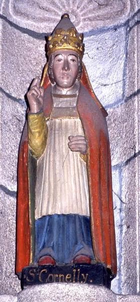 Saint Cornély ou saint Corneille est coiffé de la tiare papale et vêtu de la chape. Il fait le geste de la bénédiction de la main droite.