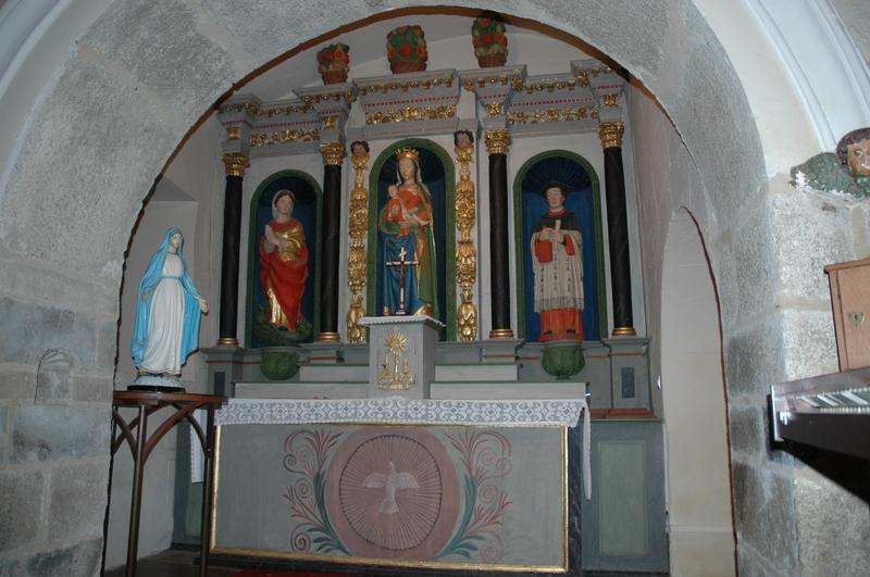 Retable composé de trois niches séparées par des colonnes : au centre, la Vierge à l'Enfant (classée Monument Historique le 21 octobre 1947), à gauche, sainte Marguerite, et à droite saint Patern.