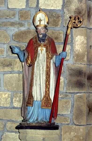 Le saint est représenté en évêque, coiffé de la mitre et vêtu d'une chape par dessus une étole. Il tient la crosse de la main droite.