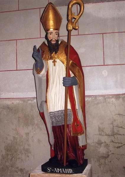 Saint Amand est représenté en évêque, mitré, crossé et chapé.