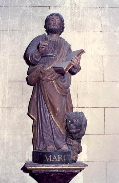 Saint Marc, l'Evangile ouvert dans sa main gauche, est accompagné de son symbole, le lion.