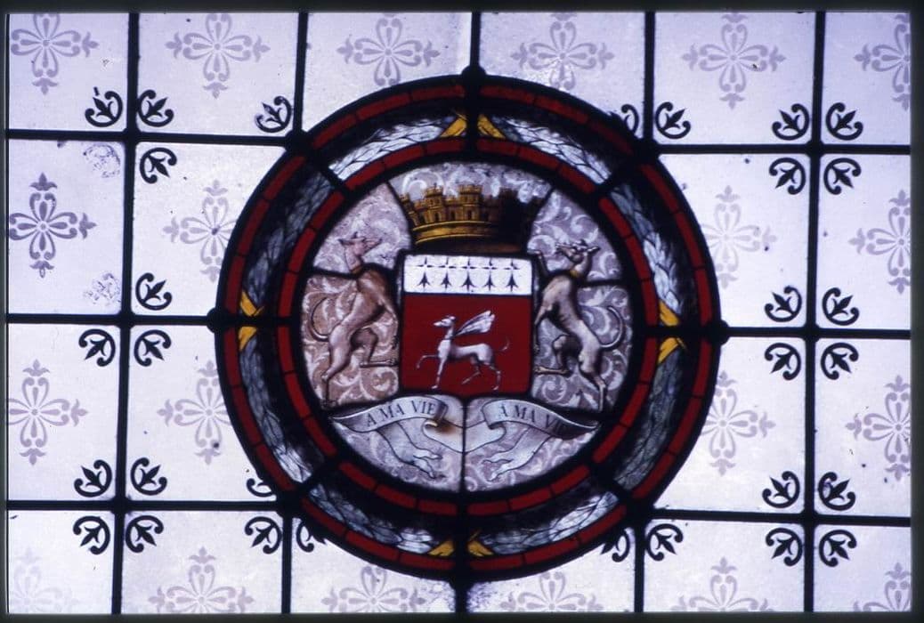 Vitrail décoratif bordé de rinceaux végétaux et d'arabesques et orné d'un blason au centre.