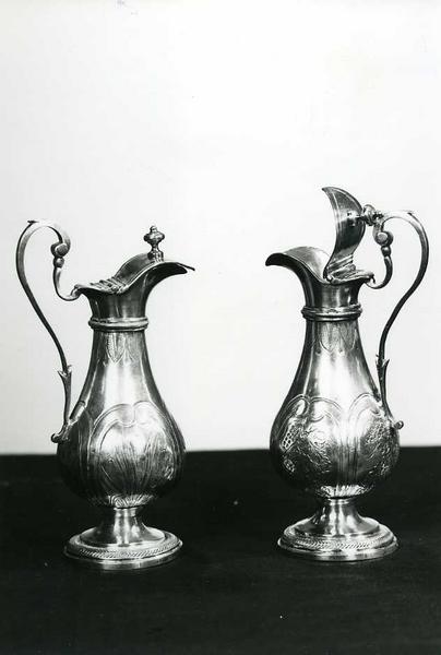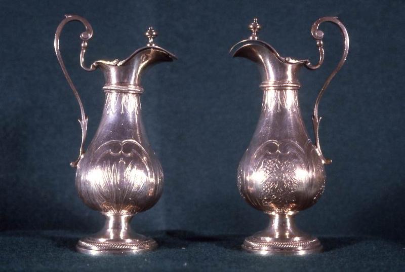 Sur l'une des burettes, des épis de blé ; sur l'autre, des grappes de raisins.
