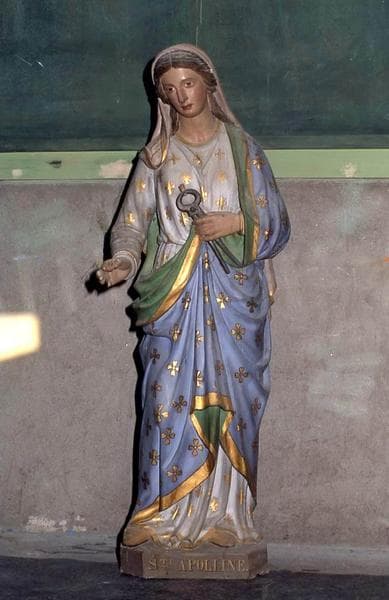 Sainte Apolline est représentée avec une paire tenailles dans les mains serrant une des dents qui lui a été arrachée.