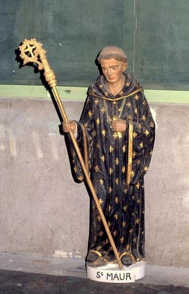 Saint Maur, tonsuré, tient une crosse de la main droite.