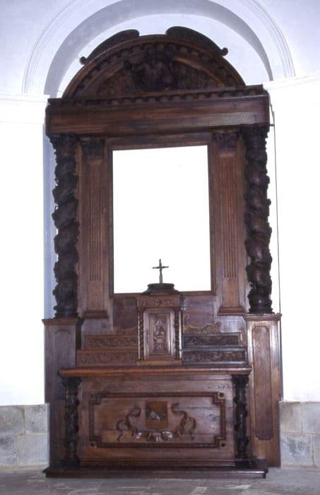Autel et retable à une seule travée, composé de deux colonnes torses soutenant un entablement et un fronton demi-circulaire.