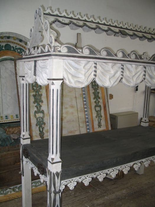 Ce catafalque est constitué d'un dais en forme de toit en bâtière sculpté au sommet et sur les côtés et bordé de draperies.