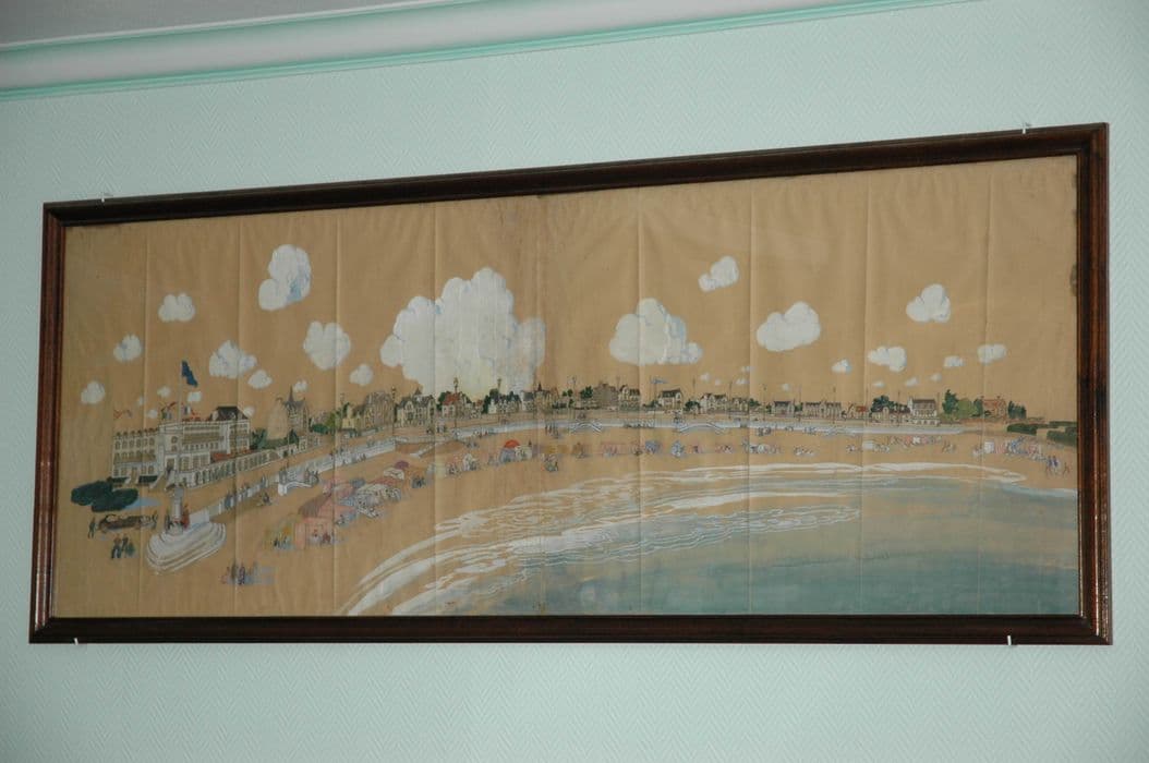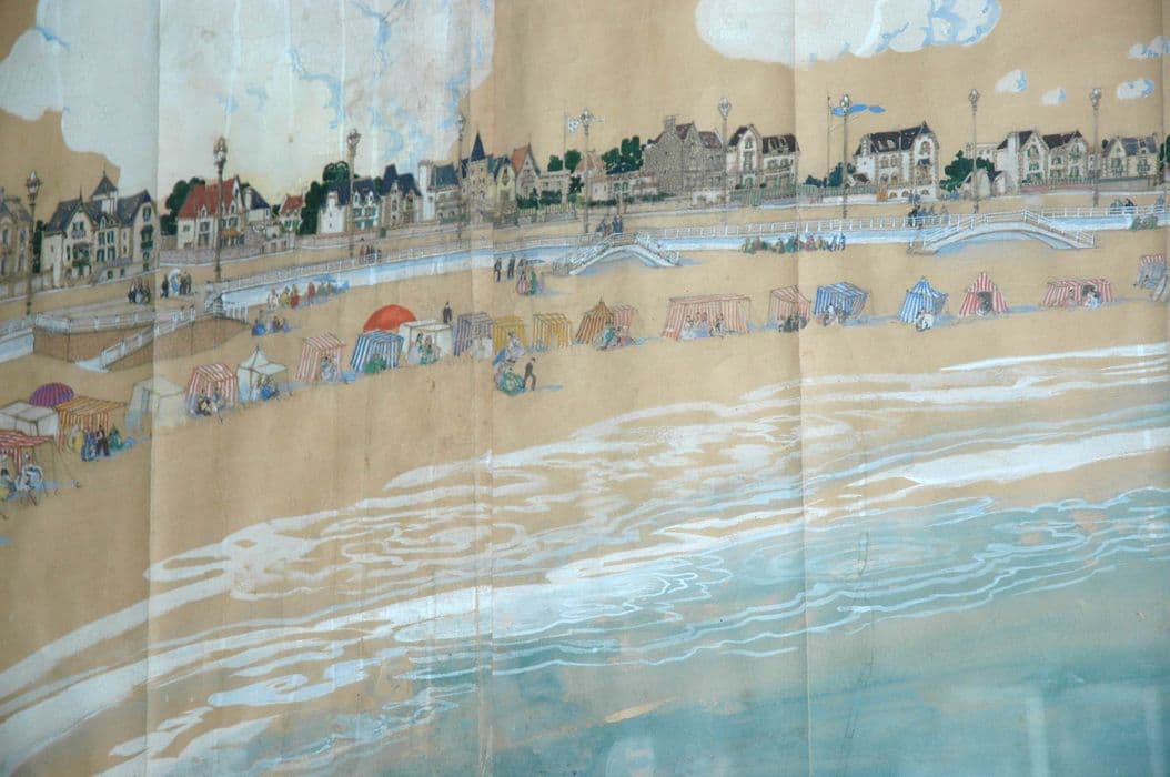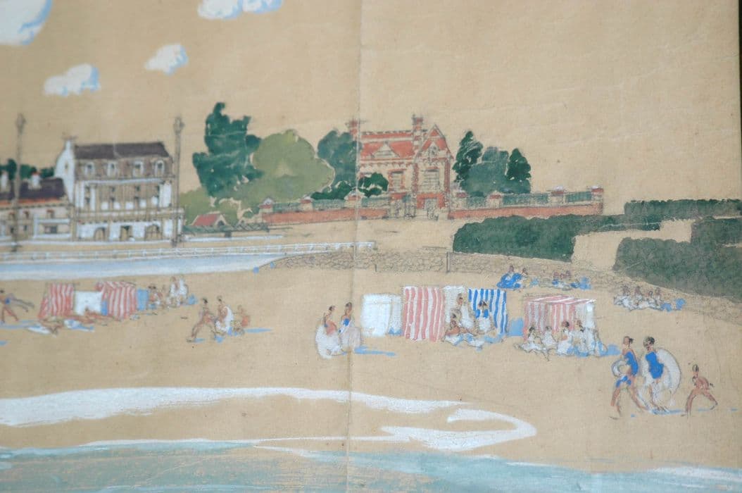 Représentation du front de mer à Quiberon avec la plage et ses cabines de bains, la digue et les maisons bordant le littoral.