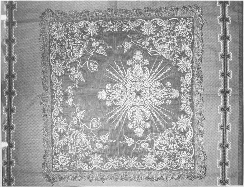Soie brodée d'or. Les pièces sont à deux faces (et sans doublure) en soie rouge et blanche. Le décor abondant et très riche, brodé en fils d'or, se répète identiquement aux deux faces.